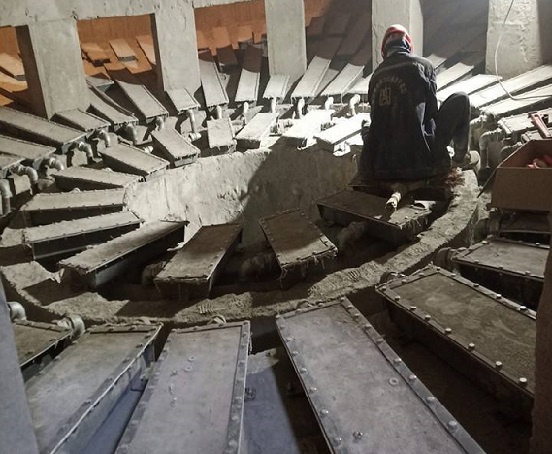 由于該儲存庫長時間運行使用,導致庫底有積塊形成堵塞。首先施工人員從頂部進到庫內(nèi),查看庫內(nèi)的余料情況。先從儲存庫的側(cè)門處開始,水泥庫清庫施工人員先將側(cè)門口堵塞的余料清出,方便施工人員進出施工。將庫底原有下料口清理干凈,確保庫內(nèi)庫底下料口上下相通,使庫內(nèi)的余料能順暢地從庫內(nèi)流通到庫底的輸送設(shè)備。如下料口無法下料,就需先做一個臨時下料斜槽,供清理時下料。打開側(cè)門時先清理側(cè)門周圍的余料和積塊。施工人員站在庫側(cè)門的平臺上用Φ18棕繩或Φ18尼綸繩作保險之用,將保險繩的一端固定在離施工庫的庫底小庫門外的部位(平臺欄桿)上,保險繩的另一端則系在施工人員的腰部,作為保險。施工人員用風鎬、鋼釬(螺紋鋼)和鐵鍬將庫底小庫門庫內(nèi)壁周圍的余料清理出庫外。